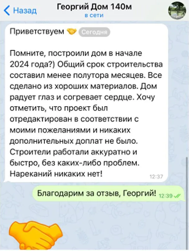 Мы работаем по прозрачной и безопасной поэтапной системе оплаты, закреплённой в официальном договоре. Уже через 2–3 месяца после начала работ вы сможете получить полностью готовый дом под ключ согласно выбранной комплектации и перечню материалов.